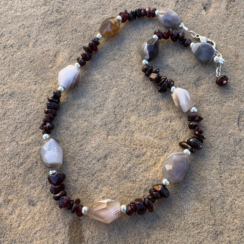 Elevate your style with this stunning Botswana agate and garnet necklace. Handcrafted with bold Botswana agate nuggets and garnet with sterling silver accents, this necklace adds a statement of elegance to any outfit. Show off your unique style with this one-of-a-kind piece. Length: 16” - 17.5” with extender chain.