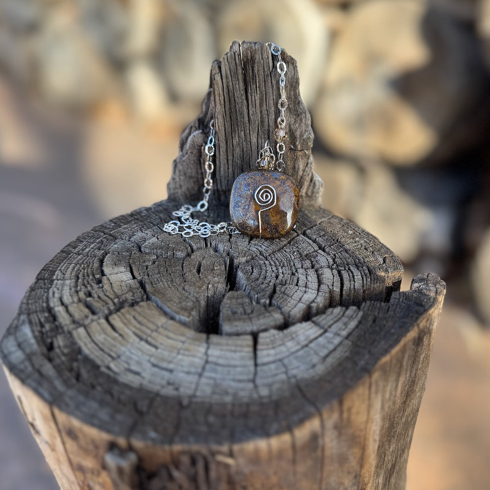 This striking wire spiral bronzite pendant necklace will make a style statement every time you wear it! The rich, earthy tones of bronzite gleam through an intricate wire-wrapped spiral design that catches the light from every angle. Suspended from a gleaming sterling silver chain, this pendant also features a sparkling crystal atop the square bronze focal. Perfect for those who appreciate unique, handcrafted jewelry with genuine character and timeless appeal.